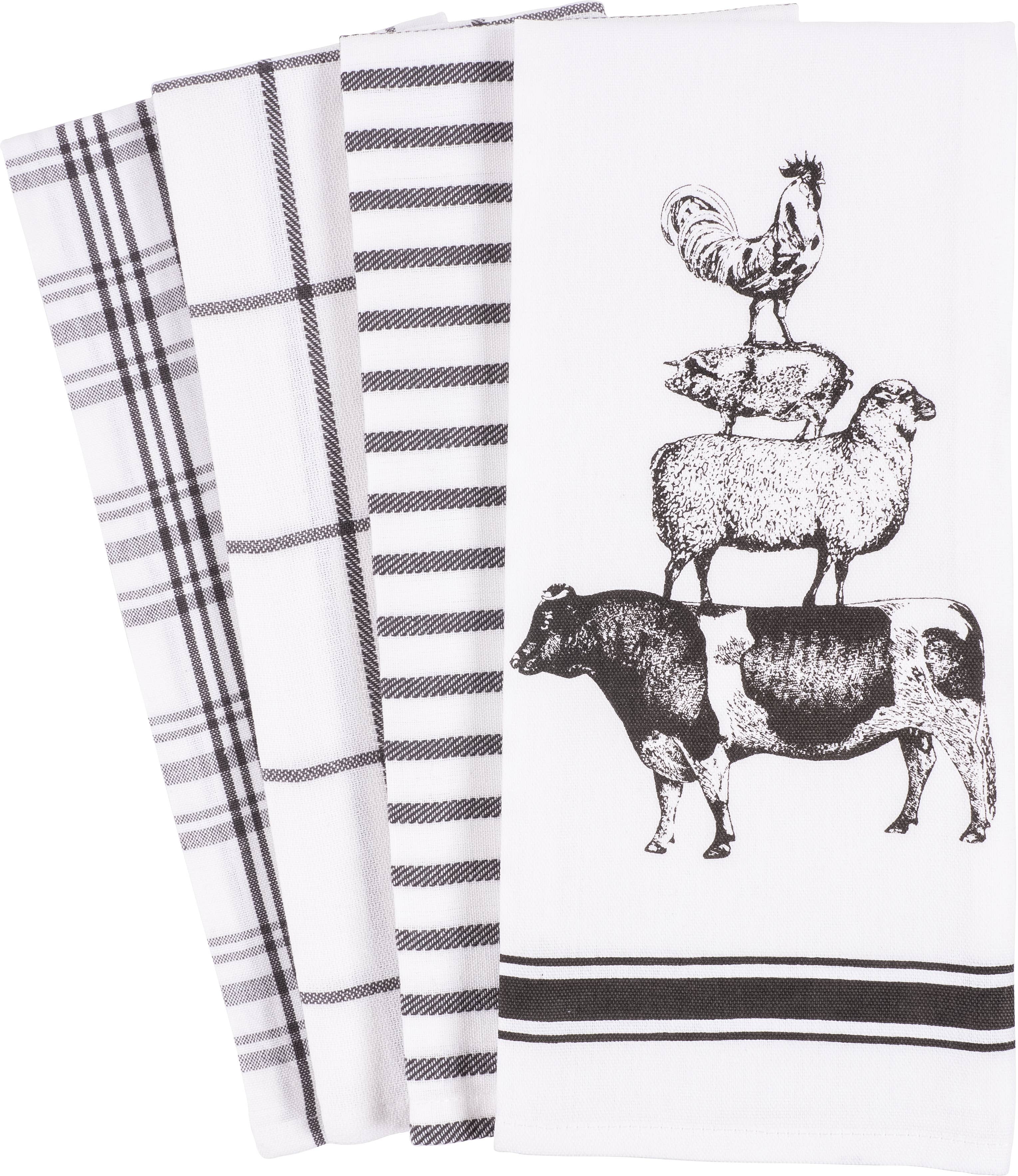 Amazon Com 3 Farmhouse Country Themed Kitchen Dish Towels Stacked Farm Animals Pig Cow Rooster Print 1 Flour Sack And 2 Dual Purpose Terry Cotton Towel Set For Dishes And Hand