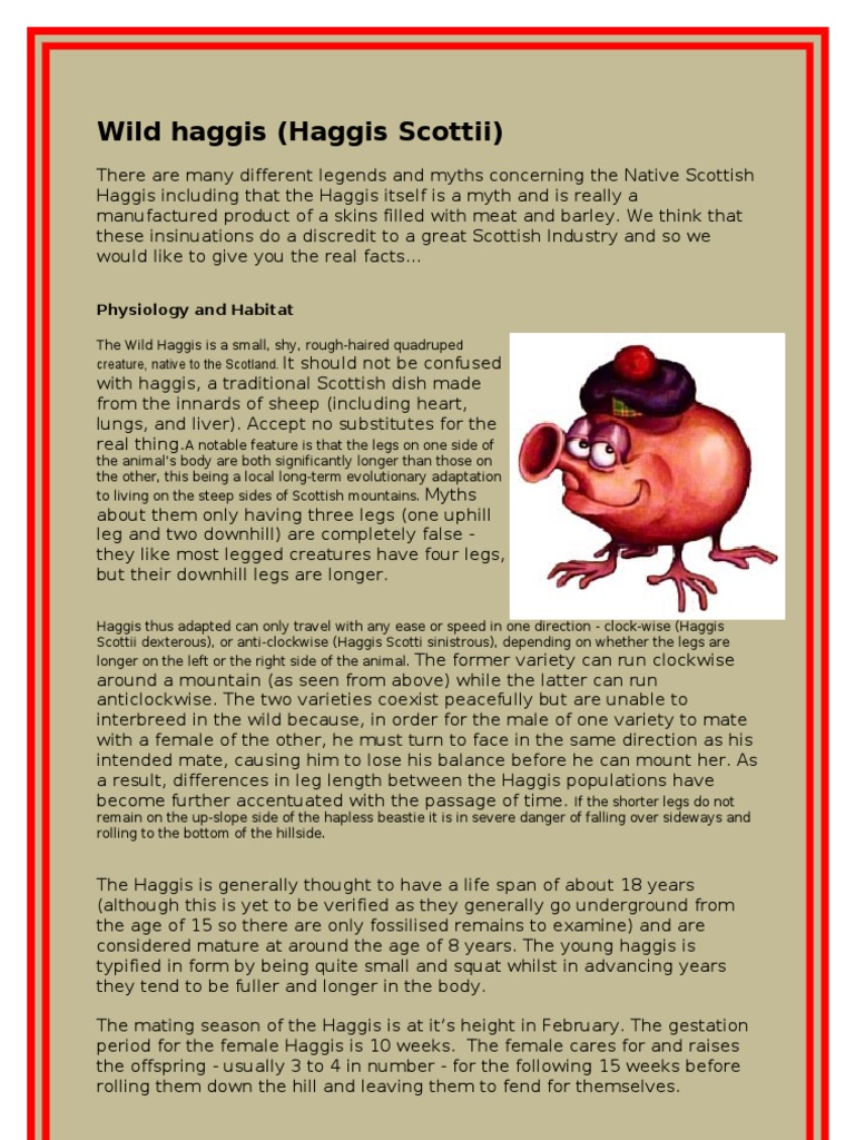 For this reason there are many myths about the haggis. This makes them incredibly adept at running around the sides of Scottish hills making it very difficult for the. But one humorous theory posits that the haggiss source is not the sheep but rather the wild haggis.